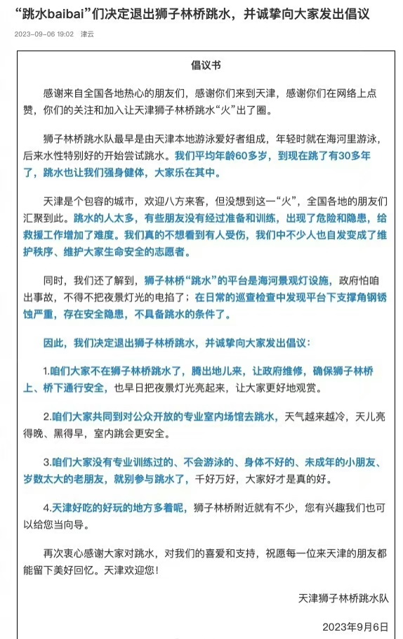跳水是具体的事件,城市才是永恒的载体。即便在9月6日上午,面对愈发汹涌的人潮,跳水伯伯们联合发布倡议书,宣布暂时退出狮子林跳水,但也仍然无法阻挡人们奔赴“哏儿都”的热潮。