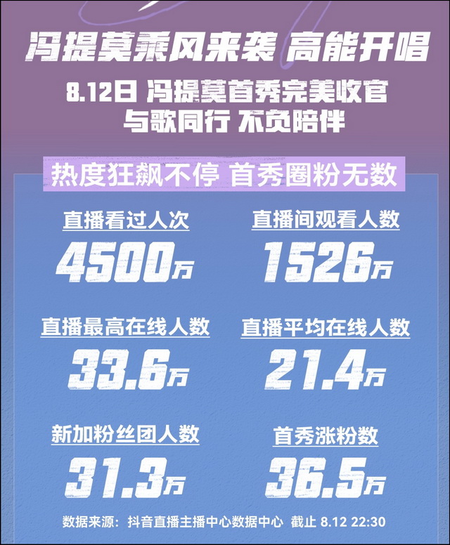 根据官方发布的战报,冯提莫抖音首秀当晚直播看过人次超过4500万,观看人数为1526万,最高在线人数33.6万,涨粉36.5万人。#冯提莫加入抖音直播#等相关话题登上热搜榜,这场直播成为了用户关注与讨论的话题中心。