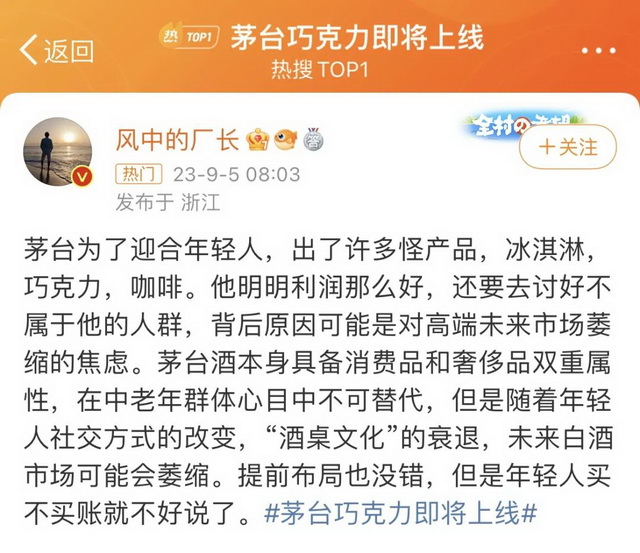 微博大V@风中的厂长 也提到,“茅台为了迎合年轻人,出了许多怪产品,冰淇淋,巧克力,咖啡。他明明利润那么好,还要去讨好不属于他的人群,背后原因可能是对未来高端市场萎缩的焦虑。茅台酒本身具备消费品和奢侈品双重属性,在中老年群体心目中不可替代,但是随着年轻人社交方式的改变,‘酒桌文化’的衰退,未来白酒市场可能会萎缩。提前布局也没错,但是年轻人买不买账就不好说了。”