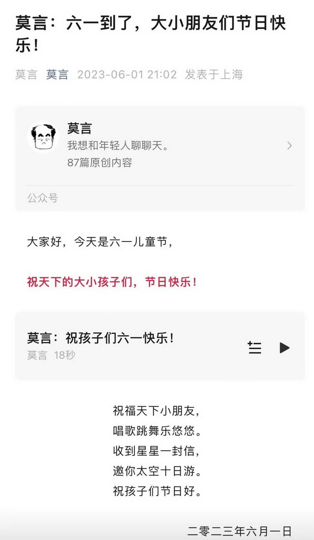 “莫言老师会真诚地和我们讨论年轻人迷茫的话题,会发语音祝大小朋友六一快乐,他一开始看不懂网络用语,后来却能把YYDS运用自如。”一位网友如此评论。在年轻人解构权威的同时,这些文学大家也在靠近年轻人。