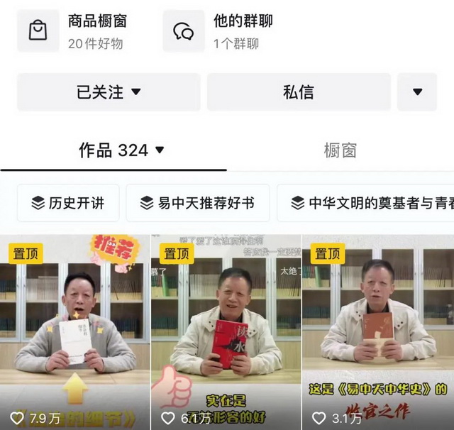 除了刘心武,易中天、蒙曼、纪连海均入驻抖音,易中天2019年就已入驻抖音,是所有人中入驻最早的,粉丝突破900万,既录制切片短视频也同时讲课、卖书。蒙曼、纪连海也都粉丝体量庞大,内容也都基本是围绕本专业进行知识科普、文化讲解。