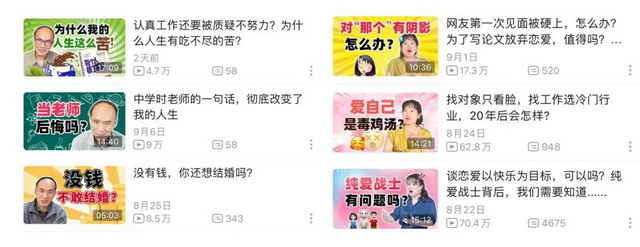 学术派的教授们则更倾向于“网红变现法”。比如梁永安与沈奕斐,这两位教授同出复旦,且都擅长社会热点分析、亲密关系梳理,他们的视频内容,从封面到文案再到话题,甚至也都有些接近。