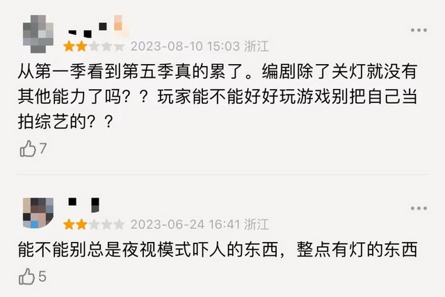 有豆瓣网友针对第五季节目嘉宾的评论是:“他们玩太多了,自己都已经对这种惊吓麻木了,就算短暂被吓到也会很快恢复过来调侃NPC。没感觉了,他们没了,观众也没了。”