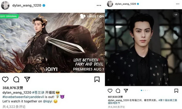 除此之外,LV的品牌活动、自己的电视剧《遇龙》《苍兰决》,王鹤棣都在不遗余力地宣传,甚至还贴心地放上《苍兰决》爱奇艺海外版的宣传图片,最新一篇帖子内容也是在宣传丝绸之路国际电影节。
