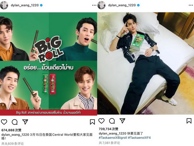 2018年新版《流星花园》席卷东南亚后,扮演道明寺的王鹤棣转年即接到菲律宾时装品牌Bench、泰国品牌Taokaenoi小老板海苔的代言,并在ins上发布多条独家宣传内容,收获上千条评论及近百万点赞。