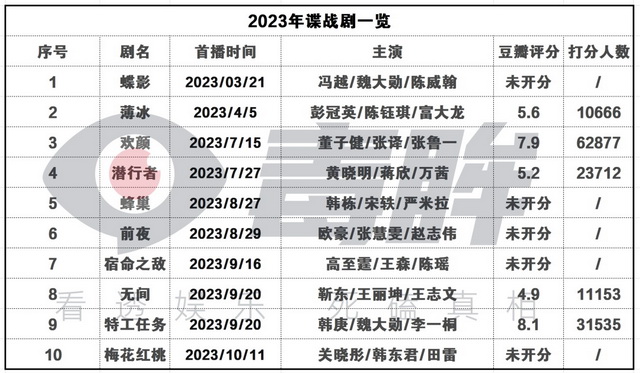 数量有所增加,阵容也有保障,但无论是热度还是口碑,都无法再复刻2009年后谍战剧的盛况。已完结的11部谍战剧中,有五部未开分,剩余六部的打分人数也均为超过10万人。其中表现较好的两部是《欢颜》和《特工任务》,但在市场上也没能掀起太大的浪花。