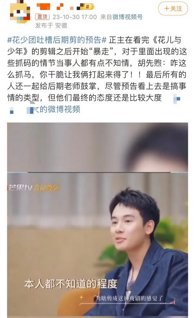 这一季《花少》甚至增设了嘉宾陪你看正片的reaction衍生节目。正片就算有再多的火药味,也能被陪看环节艺人们的当场解释浇灭。《花少团陪看记》第二期里,看到芒果熟悉的紧张BGM,胡先煦直接问“咋剪成这种抓马的感觉了”,还拉着王安宇当场“剧透”起了下一期可能的冲突。