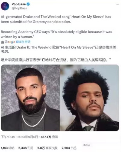 北美乐坛更早往前走了一步,AI不仅能翻唱,而是的确能“创作”。4月中旬时,名为Ghostwriter977的用户用歌手Drake和The Weeknd的作品训练AI模型,发布了“原创”歌曲《Heart on My Sleeve》,一个周末的时间便在Spotify上收获60万播放量、在TikTok收获1500万点击。