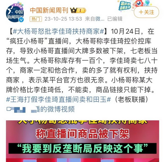 在10月24日晚间的直播中,一款美容仪的价格因为低于李佳琦直播间,而被迫下架。小杨哥的哥哥大杨哥,当场表达了对李佳琦“底价协议”的不满,直言“你们想要的一些大牌都没货,全被锁了,不给抖音,全被那(李佳琦)搞去了。”并且声称要去反垄断局反映这个事情,“这么多品牌,因为一个人搞乱套。”