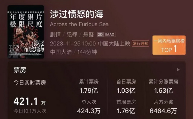 其中,曹保平新作《涉过愤怒的海》表现不俗,在上映首日就收获了超过1亿的票房,目前累计票房逼近2亿。根据猫眼专业版,预测票房已经在5.95亿,有望打破曹保平作品的票房纪录。
