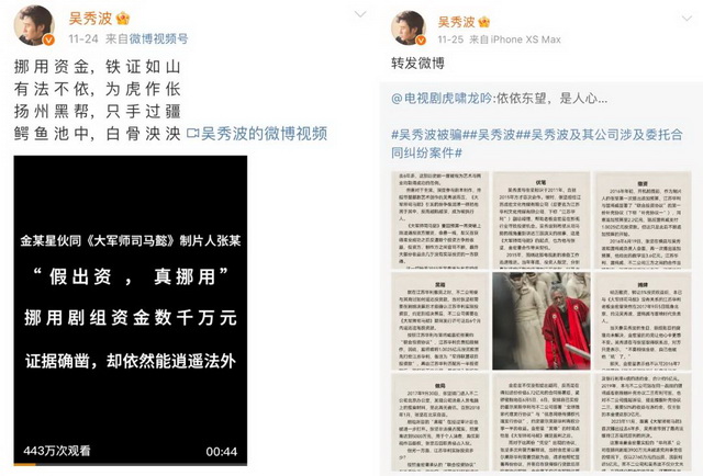 此后,吴秀波先是发微博解释被人设局,“辛辛苦苦为资方拍戏,被两个身上背着一身案子的骗子,用假章假合同设局”、“害到破产”,后又转发电视剧虎啸龙吟的官方微博,疑似与剧方一起追讨说法。