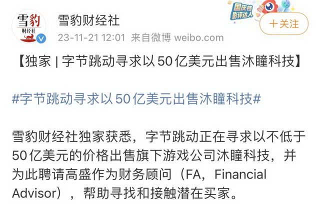 而此前另据雪豹财经社消息,字节跳动已经在寻求“以不低于50亿美元的价格”出售旗下游戏公司沐瞳科技,后者旗舰产品《无尽对决》,是在东南亚、蒙古等市场有相当高人气的MOBA类游戏。知情人士透露,字节跳动想要卖出这个价格相当难。