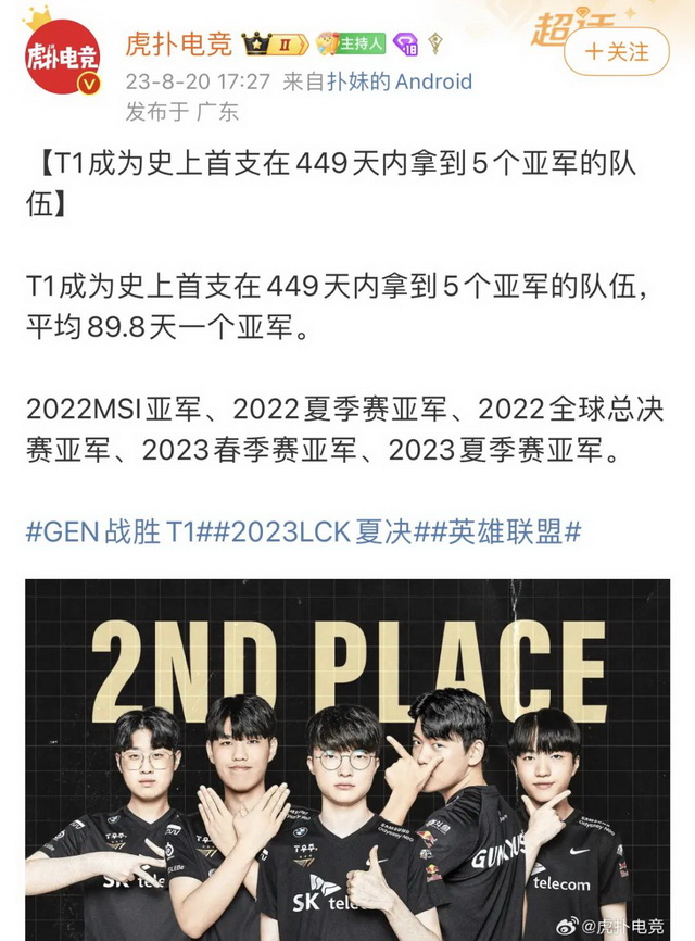 在刚刚结束的决赛上,WBG以0-3的成绩不敌T1。至此,T1完成了对LPL四支队伍的横扫,其中只有JDG从T1手上拿到一局胜利。