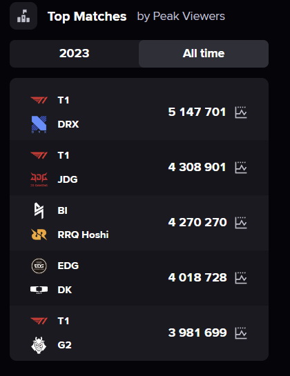 赛事数据也能证明这一点,根据Esports Charts的统计,本届T1对阵JDG的半决赛以超过430万的观众人数位列赛事热度总榜第二位,T1的赛事独占三席(不含国内直播平台数据);另外,据电子竞技排行榜显示,Faker不在期间LCK的平均观众人数仅为39万人,Faker回归后则创下了47万名观众的记录。