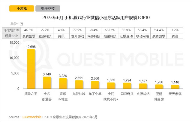 《咸鱼之王》就是在小游戏生态中较早跑通商业路径的代表产品,IAP比例高达九成。据QuestMobile,《咸鱼之王》6月月活1.26亿,而亿级数据一般只有滴滴出行、美团团购等生活服务类小程序才能轻松达到。