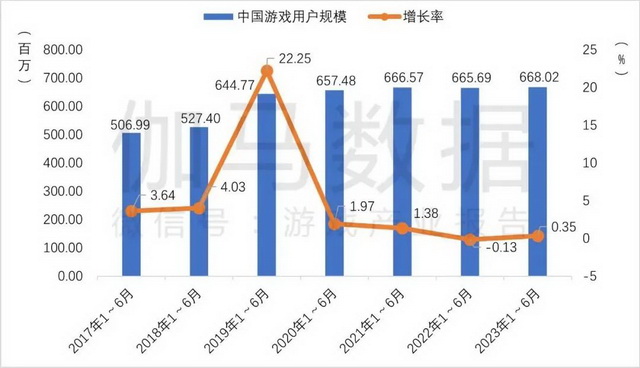 按游工委去年披露的数据,2022年中国游戏用户规模出现了近10年来的首次下降。而《2023年1-6月中国游戏产业报告》则显示,今年上半年中国游戏用户6.68亿,同比增长0.35%,尽管有所回暖,增速依然极其缓慢。