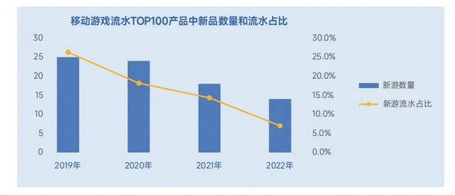 据伽马数据的《2023年游戏生命周期洞察报告》,流水Top100产品中,新游流水占比已由2019年的25%以上降至2022年的10%以下,手游新品上线半年后流水普遍不足首月10%。而多份报告均指出,小程序游戏的生命周期天然比App游戏更短。