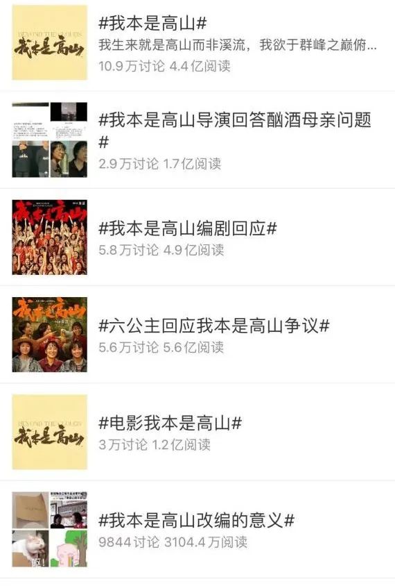 6000万不到的票房意味着不足150万的观影人次,但从上周到现在数次登顶热搜,一个热搜话题里就有上亿次的阅读——不难看出,《我本是高山》的群众讨论热情,远远大于观影热情。