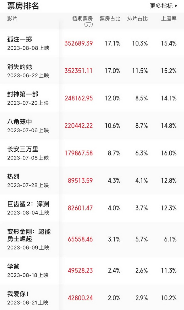 2023暑期档票房前十(数据来源:猫眼专业版)