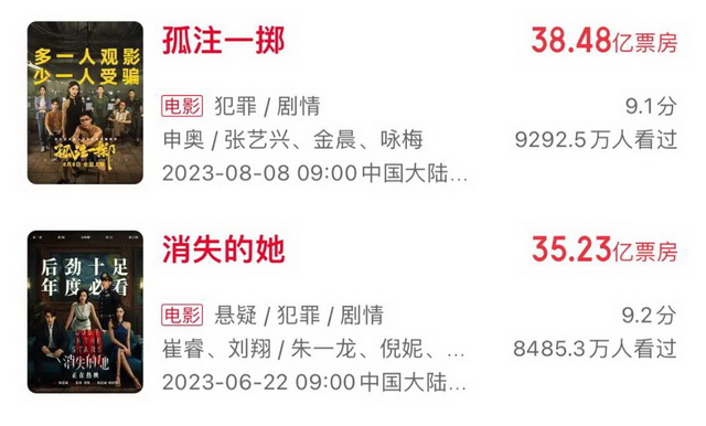 今年暑期档的票房冠亚军《孤注一掷》《消失的她》,无不遵循这套市场规则。最终,它们成为今年暑期档的冠亚军,包揽70亿票房,占今年暑期档总票房的三分之一。