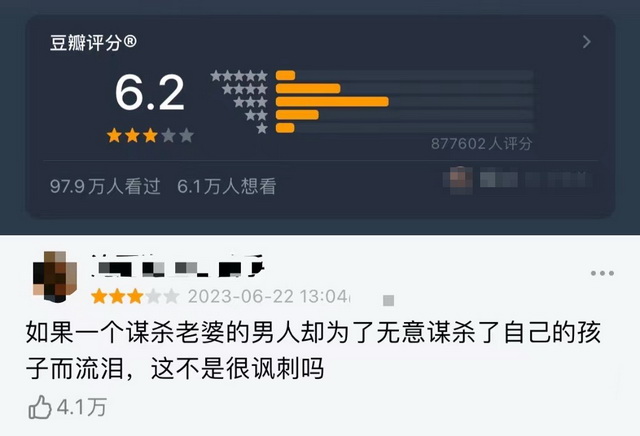 在豆瓣评论区,有不少观众对此情节设置产生不满,最高赞的短评写到,“如果一个谋杀老婆的男人却为了无意谋杀了自己的孩子而流泪,这不是很讽刺吗?”