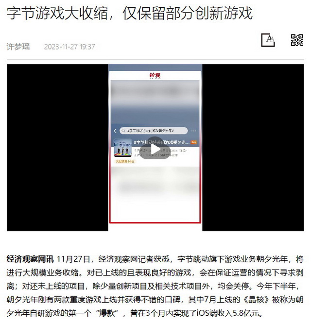 11月27日,经济观察网等众多媒体曝出,字节跳动旗下公司朝夕光年将进行大规模裁员,已上线且表现良好的游戏,会在保证运营的情况下寻求剥离,未上线的游戏除少量创新项目外,全部关停。