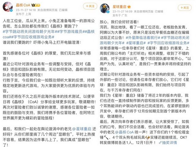 从目前的事态发展来看,短期内,字节不会像外界猜测的那般“全盘砍掉游戏业务”。除了在内部“更聚焦部分创新型游戏及相关技术的探索”,已运营项目中,《晶核》和《星球:重启》都迅速发布回应,《晶核》项目组表示公司对游戏业务的调整对其影响有限,《星球:重启》的公告标题就叫《别担心,我们会好好活着》,称已储备了近两年的版本内容。
