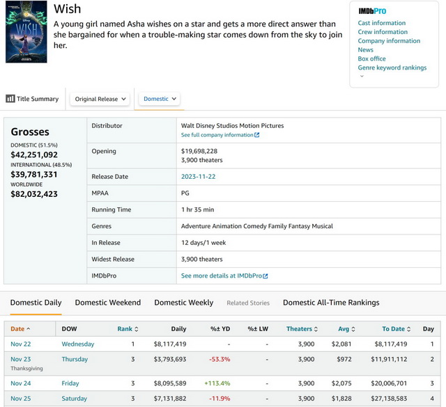 这一成绩落在《魔法满屋》(2721万美元)和去年的《奇异世界》(1215万美元)间,未能创近四年“感恩节”档期新高;而在迪士尼动画工作室的序列中,《星愿》同样位居倒数之列。实际上,在The-Numbers的模型中,《星愿》的预测值高达4870万美元,实际数字仅为40%左右。即便计入工作日的收益,《星愿》前五天也仅累计至3161万美元,依旧与业界的高期待相去甚远。