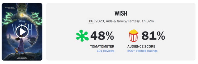 从口碑来看,《星愿》的烂番茄新鲜度仅为48%,影评人表示虽然多部迪士尼经典以彩蛋的形式出现,动画制作效果也非常精美,但“情怀并不能取代真正的故事讲述魔力”;而《星愿》的爆米花指数达到81%,显示影迷的宽容度较媒体更高。另外,《星愿》在IMDb上只得到5.9分(5.6千个评价),与《魔发精灵3》(6.0分)处在同一层级。