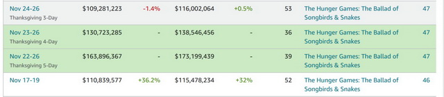 在新片表现承压之际,前周冠军《饥饿游戏:鸣鸟与游蛇之歌》微跌35%,以2904万美元完成两连霸,累计票房升至9860万美元,若加上周一收成则顺利破亿,成为狮门今年第二部达标的作品,排在春季的《疾速追杀4》(1.87亿美元)之后。由梦工场出品的《魔发精灵3》则新增23家影院,次周缩水约四成至1781万美元,公映10天后共拿到6476万美元,掘金势头颇为稳健。