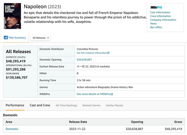 随后,《拿破仑》铺开至北美3500家影院,首日斩获773万美元位列亚军,并一直坚守这个位置,首周末以2064万美元收官,单馆收益达到5897美元,力压迪士尼新片《星愿》(1970万美元)。