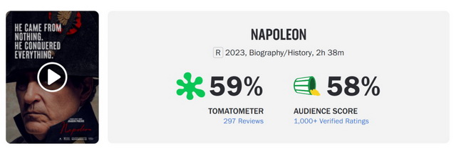 从口碑来看,《拿破仑》的烂番茄新鲜度只有59%,主流媒体表示“这是一部狡猾有趣的史诗,充满了华丽的场景”,但故事本身过于分散;同时《拿破仑》的爆米花指数同样低至58%,可见观众对这部史诗巨片也并不买账。《拿破仑》在IMDb上的平均分为6.7分(约4.1万个评价),低于导演前作《最后的决斗》(7.4分),也不及广受好评的《花月杀手》(8.0分)。