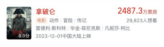值得一提的是,拿破仑也在12月初登陆了中国市场,只不过题材和口碑影响下,上映一周后票房只在2400万元左右(数据来源:灯塔专业版)。
