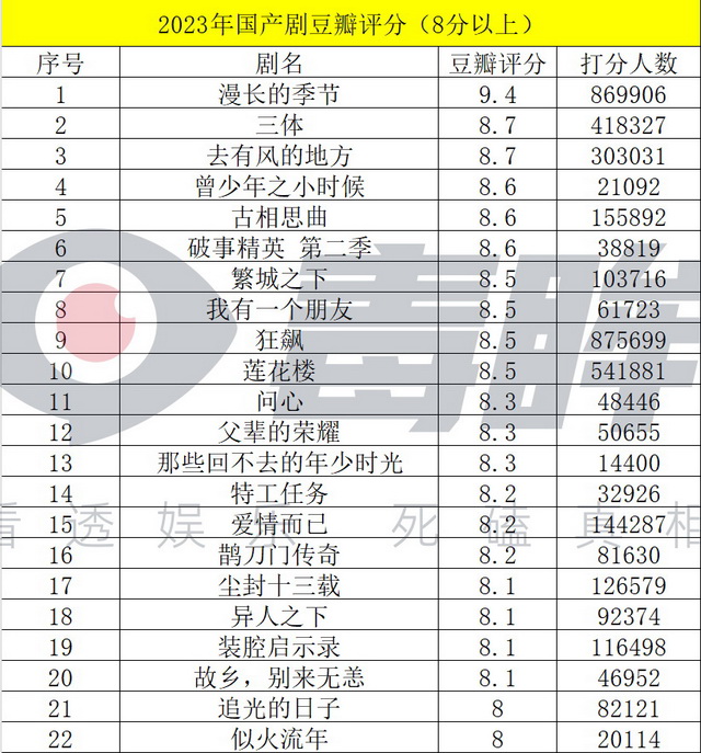 2023年还未结束,已经有22部国产剧的豆瓣评分达到了8分以上——2019年位列全年评分榜单第十位的《庆余年》,才只有7.9分,甚至进不了今年的TOP20。