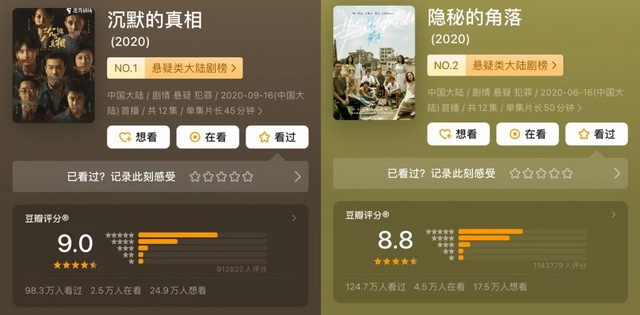 如果再将时间维度拉长,2019年只有《我在未来等你》一部剧成功晋升8.5分行列,2020年则只有《沉默的真相》和《隐秘的角落》两部“悬疑王牌”。