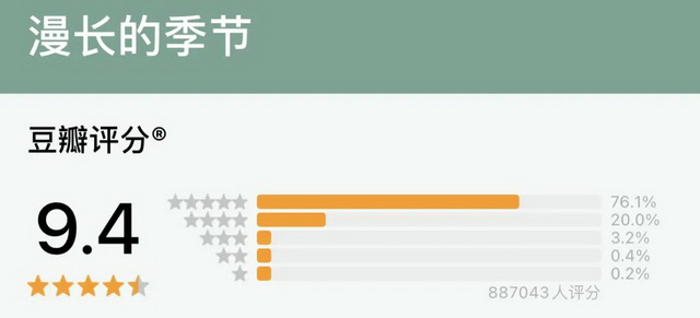 纵观豆瓣电视剧评分总榜,9.4也是个非常亮眼的分数,和《甄嬛传》《父母爱情》同分。众所周知,老剧在豆瓣是受到优待的,很多剧集开分都在8分左右,在“时代滤镜”的加持和后来者的对比下,一点一点进入9分序列。新剧要想杀入前列,并不是一件容易的事。如果不算港台剧,上一部分数这么高的国产剧,还要追溯到2015年的《琅琊榜》。