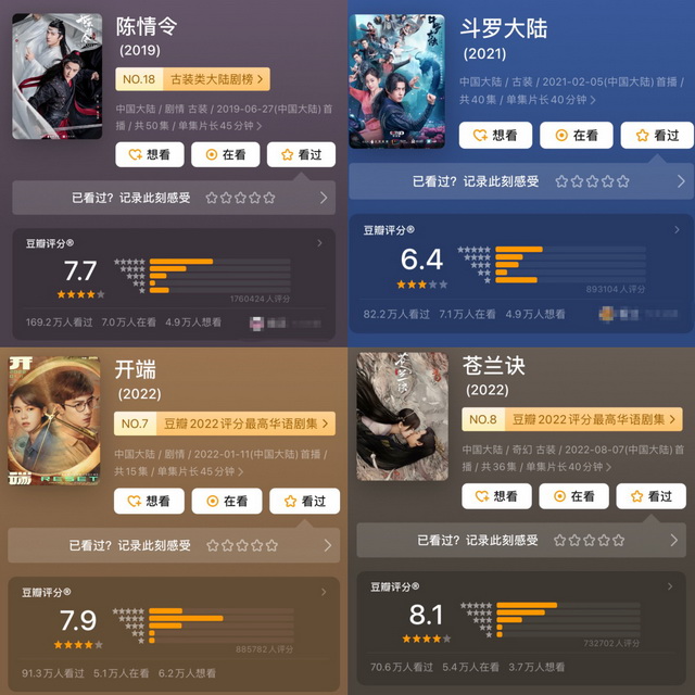 另外,同样能体现豆瓣“舆论价值”的是耽改题材的表现。今年只播了8集的《光渊》有7.5分;《山河令》以8.5的分数排在当年的第四位,仅次于《觉醒年代》《山海情》和《功勋》;《陈情令》评分虽然逐渐跌至8分以下,但至今仍然保持着超过170万的打分人数记录。