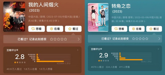 不变的是,豆瓣用户对于烂剧的容忍度仍然很低。有超过42万人为《我的人间烟火》打出2.8分,明道和蒋雯丽谈恋爱的《转角之恋》2.9分,两位95花赵露思和田曦薇领衔主演的《后浪》和《花轿喜事》都只收获了4.1分。