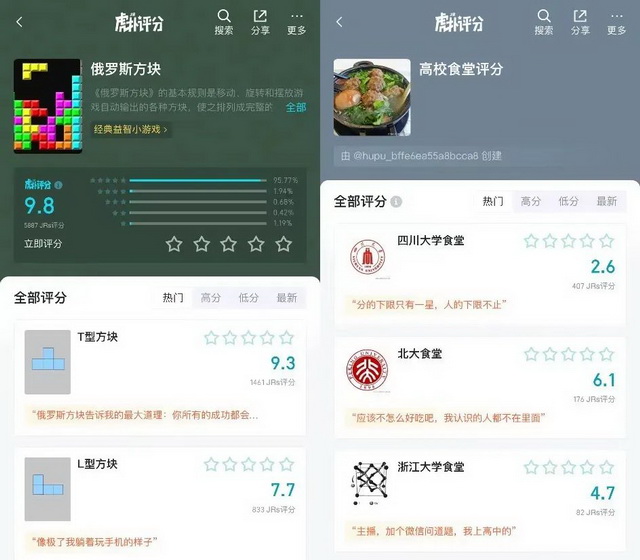 其实,早期虎扑的评分体系仍然仿照以豆瓣为代表的传统体系——打分五星制,评分呈现为十分制,以明星的作品为对象打分。但当这一功能基于社区本身的特殊性开始泛化后,就出现了给“大学食堂”和“俄罗斯方块”打分的独特现象。