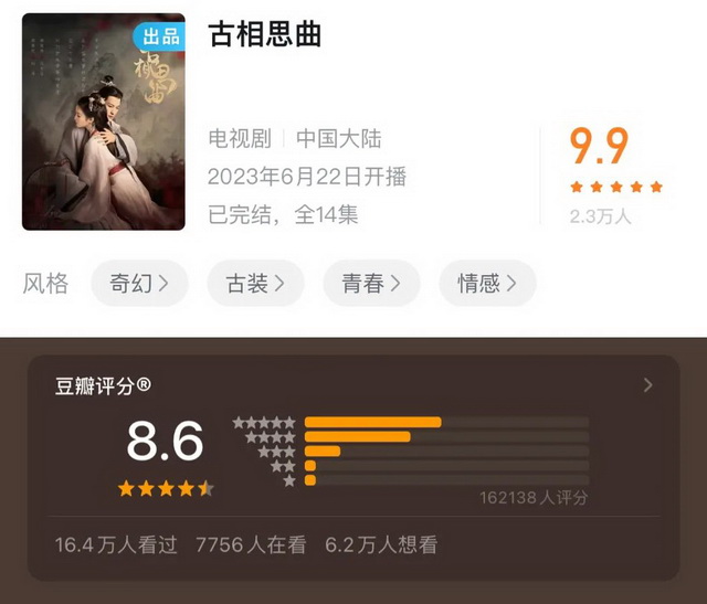 很多内容社区都在尝试为影视作品搭建基于自身内容生态的评分系统,一方面促进用户在平台上讨论内容的活跃度,也便于影视作品在站内的专有营销。不过,微博、B站等平台的评分体系,目前仍然未能展现真正的参考价值,B站9分以上的剧集数不胜数,豆瓣8.6的B站自制剧《古相思曲》,在B站收获了9.9分。