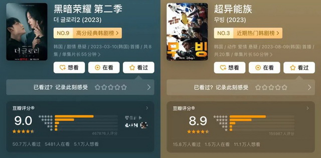 比如,海外剧集过去一直被认为有“滤镜”,分数平均要比国产剧高出1~2分。不过,这种情况今年并不明显,海外剧正在豆瓣“祛魅”。今年评分在8分以上、打分人数超过1万的韩剧有12部,其中超过10万人打分的只有《黑暗荣耀 第二季》和《超异能族》;美剧的高分剧则更不具备“含金量”,大部分打分人数都未超过1万。