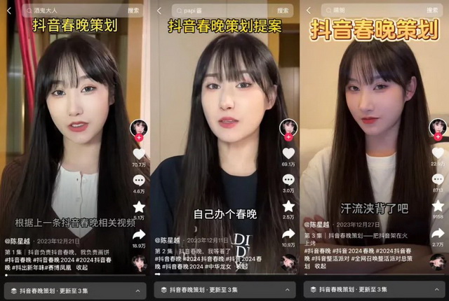 这很容易让人联想到最近在抖音内部兴起的“抖音春晚”热潮。这起源于一位叫“陈星越”的博主,其在视频中称抖音可以邀请自家博主开办晚会,把对应的节目形式与代表博主都详细匹配,用户在评论区热情回应, 还纷纷列出自己想看到的短视频博主和热梗。