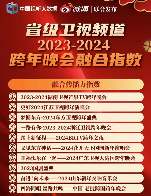 不管是从用户还是平台角度来看,这种方式也的确奏效。据中国视听大数据微博联合发布的《省级卫视频道2023-2024跨年晚会融合指数》报告显示,融合传播力指数方面,湖南卫视芒果TV、江苏卫视、东方卫视、浙江卫视位居前四,跨屏影响力指数也是四家排排坐,值得注意的是,这四家也是贡献今年“网红舞台”的主力军。