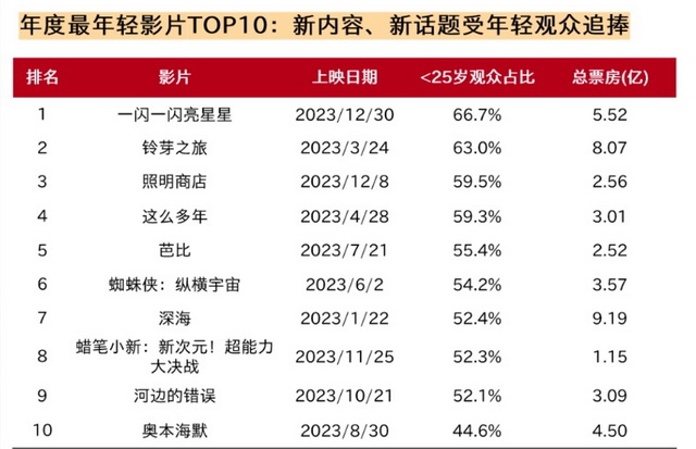 成长的文化环境不同,决定了年轻一代的认知体系和从前有着巨大差异。在猫眼《2023中国电影市场数据洞察报告》中可以看到,25岁以下观众占比最高的影片里,只有像《芭比》《蜘蛛侠:纵横宇宙》《奥本海默》这种更创新的影片占比较高。