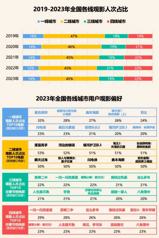 据灯塔,自2019年之后,三四线城市观影人次占比就得到了3%-7%的提升,并且已经逐渐稳定份额。从2023年全国各线城市用户观影偏好也能看出,一二线城市的观影人次占比TOP10中,好莱坞进口片的身影并不少见,而在三四线城市则一个也没有,对比非常鲜明。