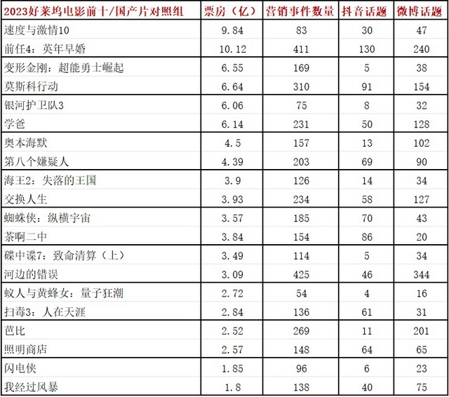 毒眸根据猫眼专业版数据,人工整理了2023年好莱坞电影票房前十的营销事件、抖音话题、微博话题数量,并与票房相近的10部国产影片进行了对照。结果很明显,除《芭比》等极个别异常值之外,大部分进口片的表现均远远不及同等票房的国产片。
