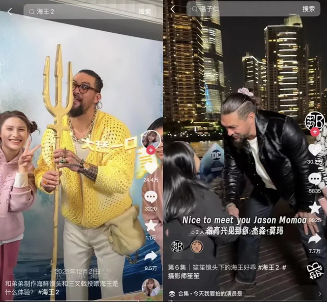 诸如首映礼、路演等线下活动,覆盖人群终究有限,其本质目的都是为了更丰富的线上传播。而今年由于好莱坞的罢工活动,也客观上导致许多影星无法配合影片宣传。罢工结束之后,像《海王2:失落的王国》的导演温子仁和主演杰森·莫玛就来到中国路演,也与一些短视频达人进行了合拍。
