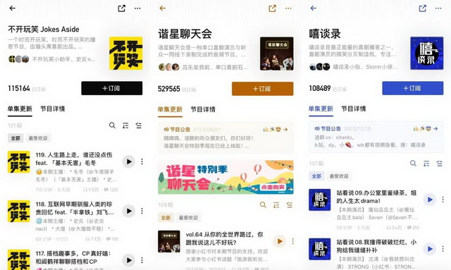 与此同时,播客正在成为新的热门形式。播客的用户属性与脱口秀的目标受众契合,不少俱乐部都选择开设播客节目。猫头鹰喜剧的《不开玩笑》,单立人喜剧的《谐星聊天会》,喜剧联盒国《嘻谈录》等节目都是平台的头部播客。去年6月,《谐星聊天会》推出的付费“特别季”,售价129,卖出了4万份。