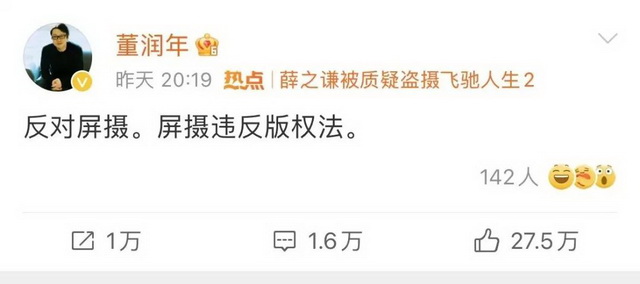 昨晚,《年会不能停》的导演董润年发布微博,表示“反对屏摄”,随后,微博热搜再次被屏摄霸占,热度盖过春山学。前十中有半数词条都与之有关。其中,“盗摄元年”登顶热搜,话题广场也是混战成一团,有坚决反对屏摄的,也有认为屏摄利于宣传、行业小题大做的。