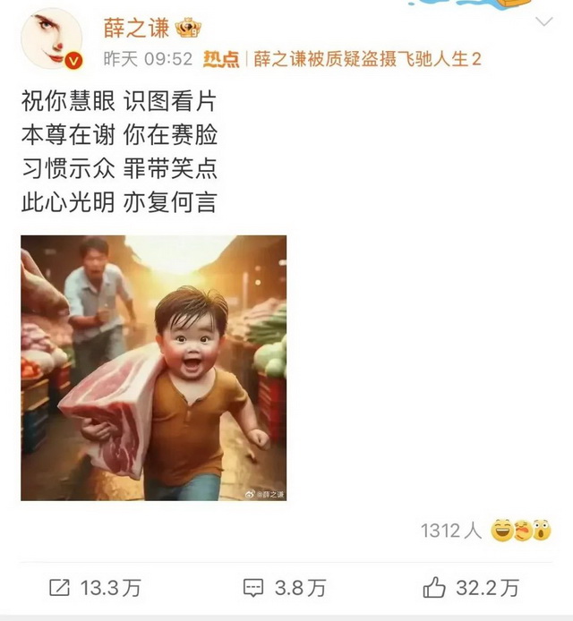 起因是这周四薛之谦发的一条微博,配文是“偷看”,内容是安利电影《飞驰人生2》,但文中配的三张图片都是在影院拍摄的照片。